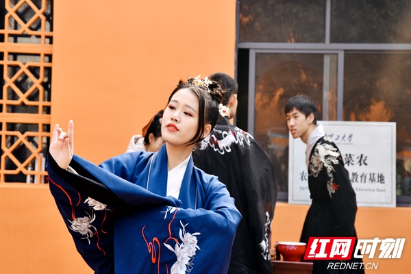 长沙理工大学东黎汉文化社及服装协会志愿者还进行了汉服、唢呐等传统文化的表演。
