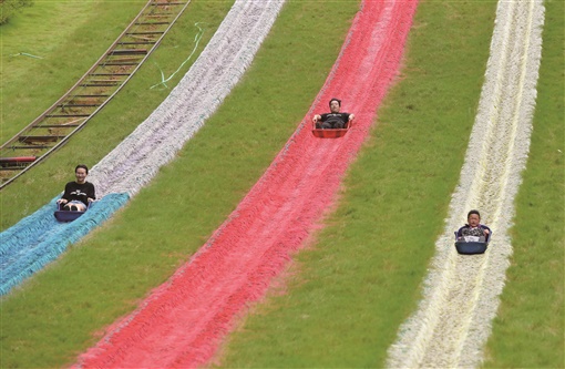 2018年8月19日,浏阳市张坊镇田溪村,游客在体验滑草项目。郭立亮 摄