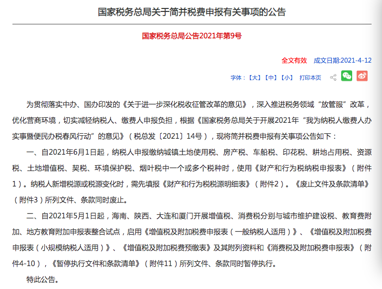 2021年5月1日起,在海南、陕西、大连、厦门4个省市开展增值税、消费税分别与附加税费申报表整合试点。税务总局将根据试点情况,2021年适时在全国推开
