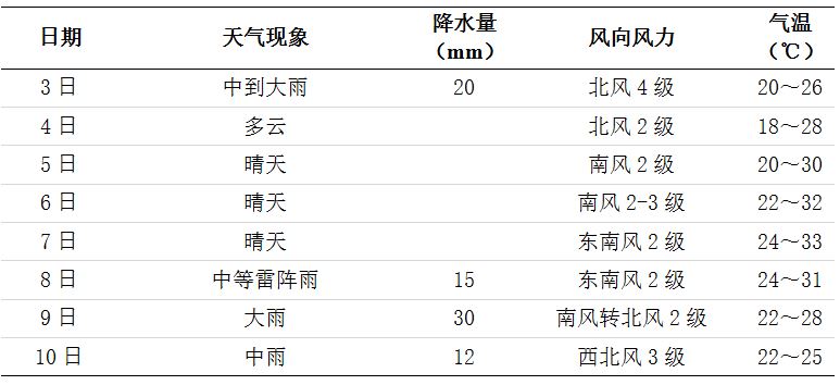 未来一周长沙依旧晴雨相间。其中4日至7日,多云到晴天,长沙气温也将迅速回升,最高温度将回到33℃;8日至10日,有一次较强降水过程,并伴有雷电、短时强降水等对流性天气。