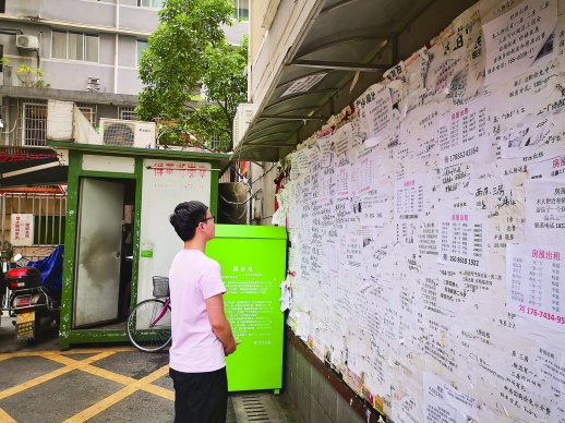 在长沙一小区门口的信息栏,一名市民正在查看租房信息。记者 卜岚摄