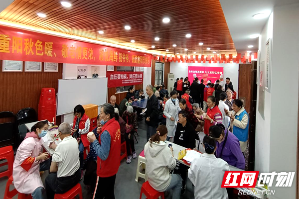 早上7点多,活动中心变身“体检中心”,三真社区卫生服务中心和目宁眼科的医生们正在给老人们量血压、测视力;活动中心一侧,十多位老人一字排开坐在中心大厅前的椅子上,手之语造型的理发师们正在认真地帮他们理发;另一边,老科协志愿者和网格员们正在为老人们宣讲警惕非法集资、防止网络诈骗等知识;最西侧,湘悦酒店的工作人员正给做完体检的老人们送上热腾腾的汤圆、面条……现场,还有身穿“红马甲”的党员志愿者们穿梭在各个场所为前来的老人指引,和谐的画面营造出浓浓的敬老氛围。