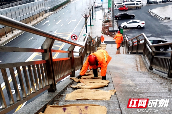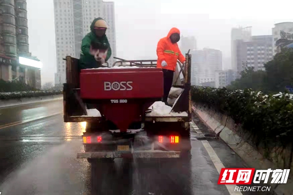 1月28日晚至29日早晨,区园林绿化维护中心提前对责任路段——侯家塘立交桥和殷家冲立交桥进行撒盐作业,确保第二天早高峰交通安全。为保证道路畅通,作为城市的“美容师”——天心环卫工人们整夜冒雪上岗,撒融雪剂、清理路面冰冻。
