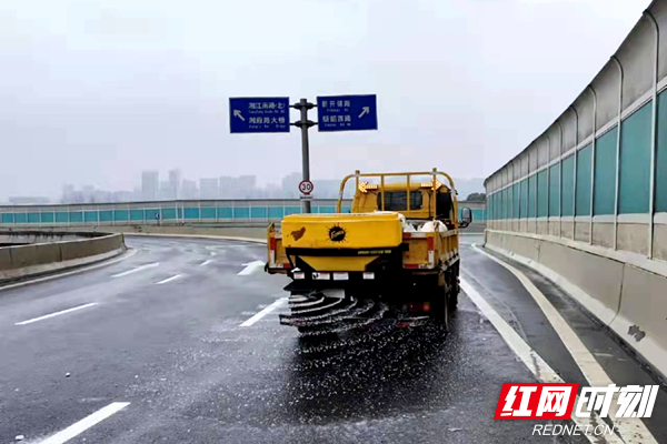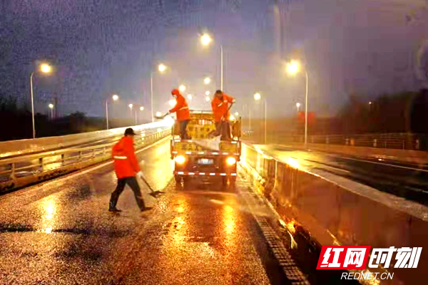 区市政设施维护中心通宵达旦对责任路段——湘府路大桥进行全面巡查并提前撒盐。