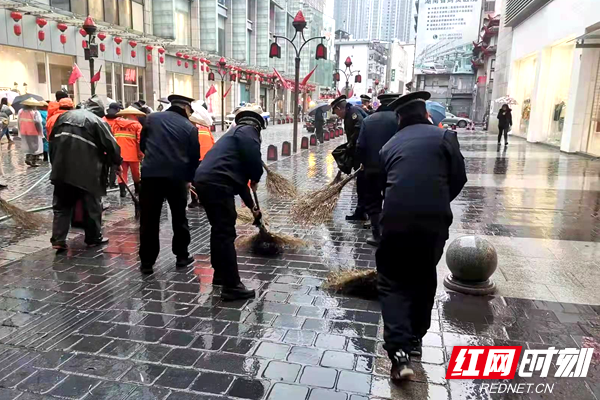 坡子街城管执法中队工作人员冒雨清扫路面。