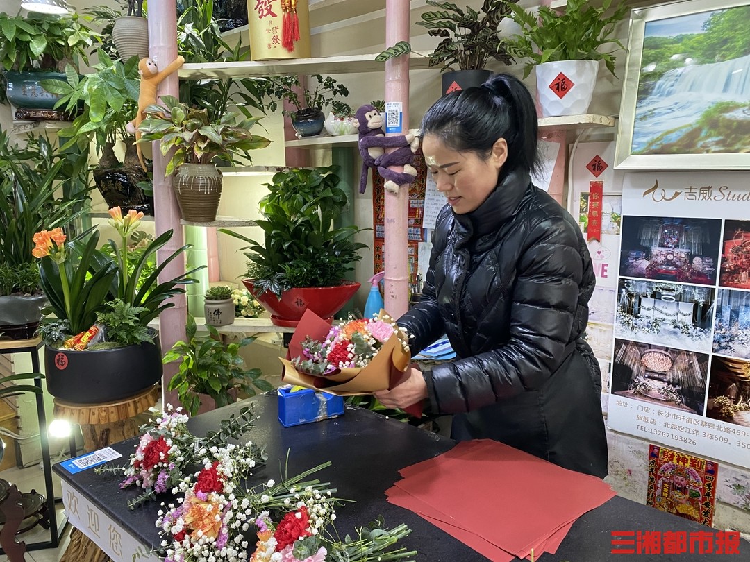 (2月14日,在位于蔡锷北路的一家花店,花店负责人正在为客人整理花束。)