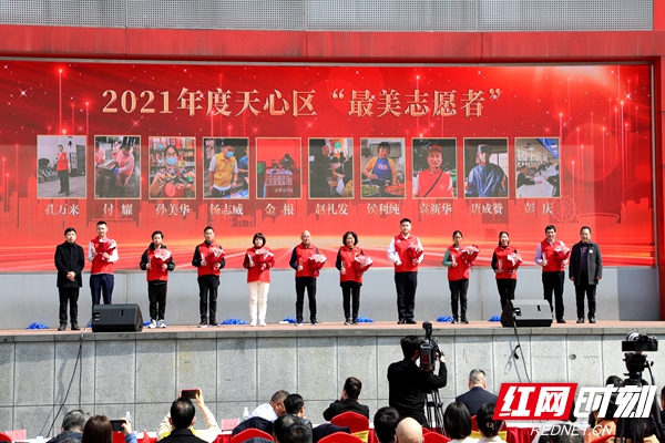 2021年以来,天心区深入推进新时代文明实践志愿服务,发动各单位开展联创共建志愿服务项目340余项,组织“雷锋志愿者在行动”志愿服务300余场,解决群众实际困难1800多个,红色马甲映衬青山绿水,志愿服务之花开遍天心。伴随着宣传片《志愿日记》一幅幅画面呈现,活动在天心志愿者的温暖足迹中拉开帷幕。