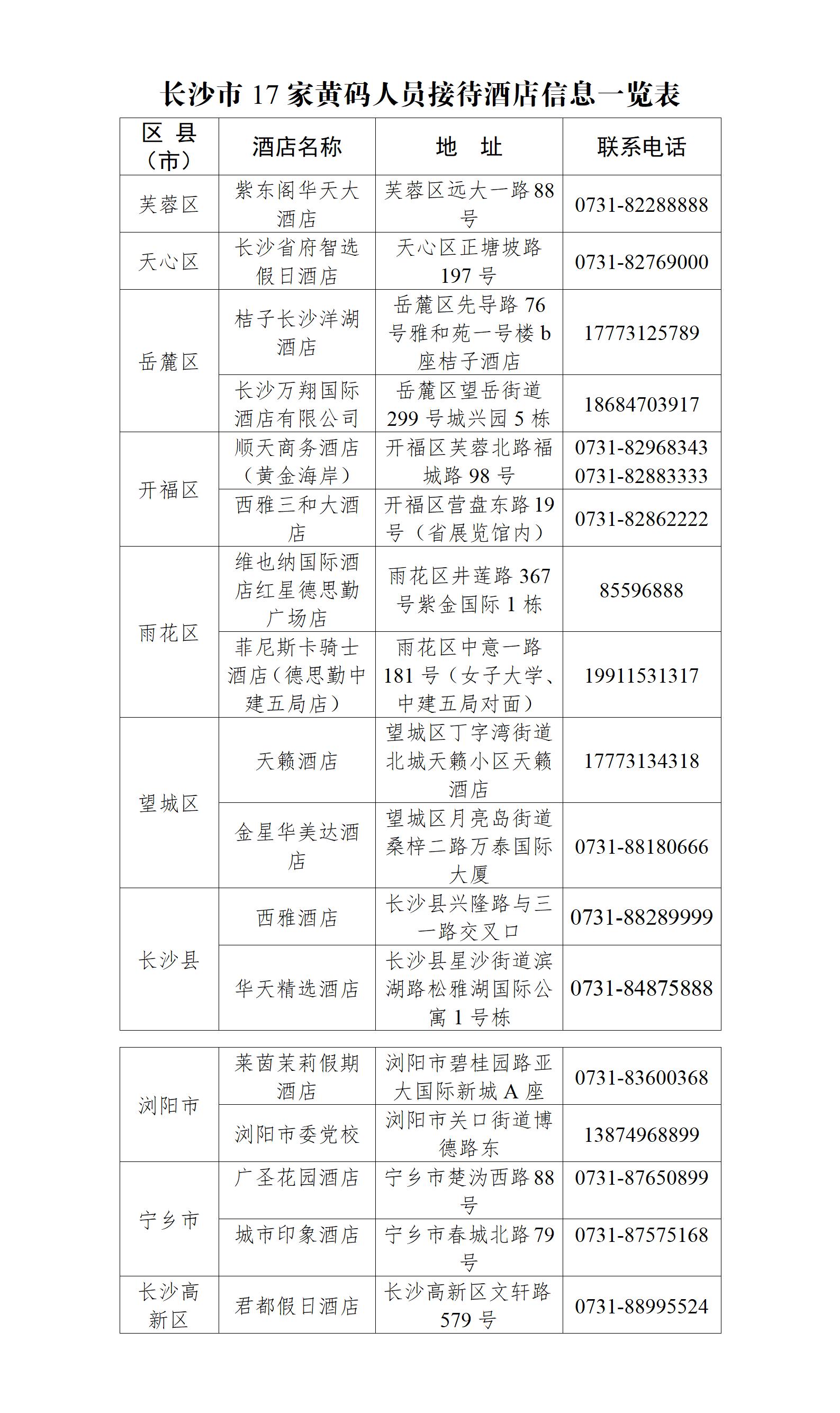 近期,国内多地出现新冠肺炎反弹疫情,长沙市亦发生数起疫情,持健康码黄码人员增多。为方便黄码人员入住酒店,长沙市设立17家接待酒店,现予以公布。