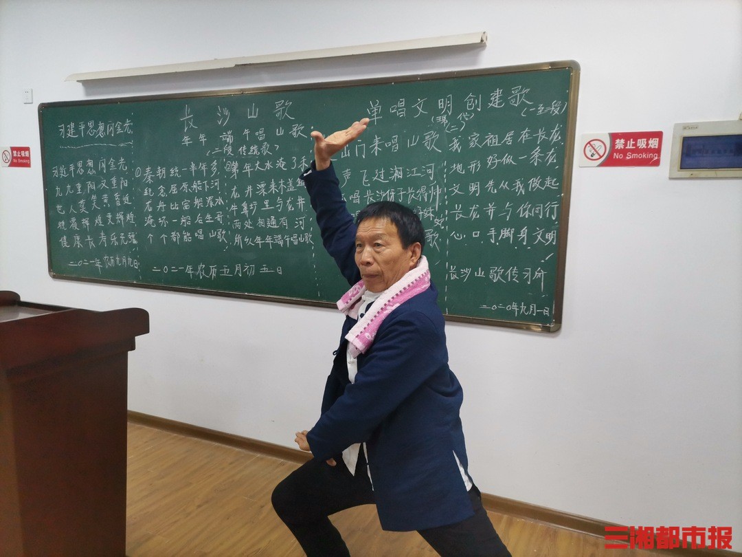 “爷爷一生收了百来个徒弟,我只是其中一个”。陈克辉说,在爷爷的监督下,他从小就保持着有些苛刻的生活习惯,从来不吃伤嗓子的食物,每天早上5点便会起床练习山歌动作、吊嗓子,“别看我78岁了,金鸡独立我都还能站上三分钟”。也正是在爷爷的影响下,陈克辉不满足于只会唱长沙山歌,他师从原望城文化馆馆长粟云,学习创作山歌。