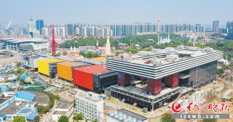 4月13日,开福区金鹰影视文化城,湖南广电节目生产基地及配套设施建设项目(“七彩盒子”)正进行外部装饰和内部设备安装。据悉,该项目由芒果体验馆、5个演播厅等设施组成,占地面积约120亩,建成后将成为面向市场的电视节目生产基地。不仅如此,“七彩盒子”东北侧的芒果电视体验馆拥有4000个座位,是中国最大专业室内剧院。长沙晚报全媒体记者 黄启晴 摄影报道