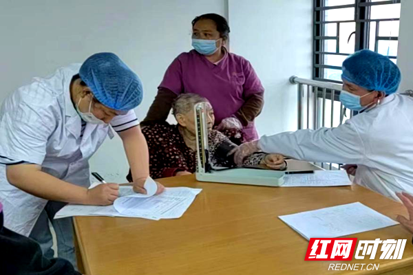 “娭毑,您的血压偏高,一定要记得按时吃药啊!平时也要注意控制饮食,清淡少盐低脂,保持良好心态。”医生细心叮嘱道。体检项目包括测量身高、体重、血压、脉搏、B超、血常规等项目。体检过程中,医护人员为老年人逐项进行检查,耐心询问他们的日常身体状况、平时生活习惯和卫生健康情况;对患有高血压、糖尿病等慢性病的老年人,进行合理用药、健康饮食方面的指导;对体检中发现的其他健康问题,进行疑难解答和有针对性地健康干预;在体检的同时进行健康知识宣传、普及医学常识。