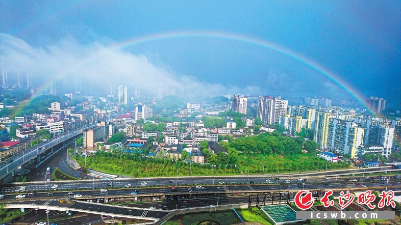 昨日,一阵清凉的暴雨过后,长沙上空出现一道美丽的彩虹,许多人的“朋友圈”也瞬间被彩虹刷屏了。