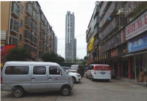 6月12日上午,江滨社区内因车辆乱停乱放和店铺乱搭乱建造成交通堵塞。提质改造完成后,这里的停车环境将改善。 记者 吕菊兰 摄