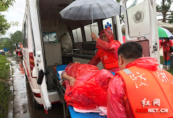 到达现场后,急救人员发现去往王娭毑家的路已经被洪水淹没了,救护车根本过不去,只得向柏家洲防汛指挥部寻求帮助。在得知情况后,柏家洲防汛指挥部立即派出一艘小船增援急救。路上,为让患者安心,在去往王娭毑家的路上,刘伟一直与家属保持着联系:“别着急,我们快到了,你们将患者抬出来,节省时间”到达王娭毑家后,王宏伟发现房屋一楼已进水,家属正艰难的将患者抬出来,急救人员赶紧下船,将患者抬到了船上。