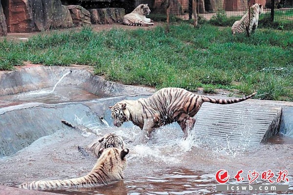 高温下,动物园白虎兄弟在水池中消暑嬉戏。均为长沙晚报记者周柏平、通讯员刘姝伶摄影报道