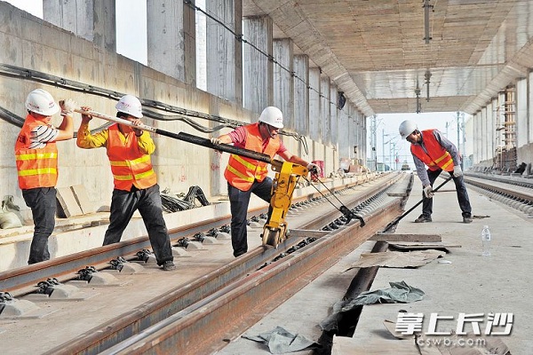 昨日下午5时许,长株潭城际铁路铺轨工人来到城铁湘江隧道口,准备进行铺轨作业。 长沙晚报记者 王志伟 摄