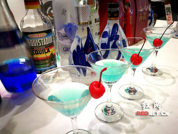 用山西汾酒为基酒现场调制而成的鸡尾酒,名叫“蓝心”,味道酸酸甜甜。