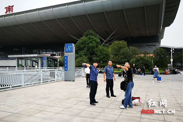 雨花区交通局武广科工作人员在站区巡查,为旅客指引道路。