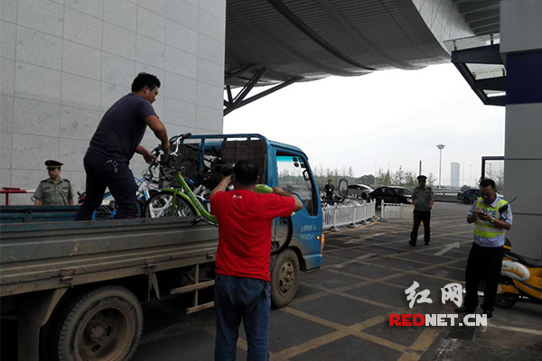 雨花区城管执法大队火车南站中队对违停共享单车进行整治。