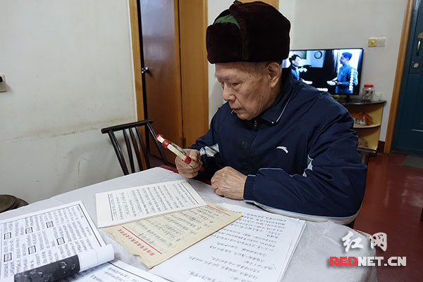 黄国麟老人正在认真检查自己新作的一篇十九大学习心得,因视力原因他也打趣道:“自己写的东西自己都看不清,必须得用放大镜才行。”