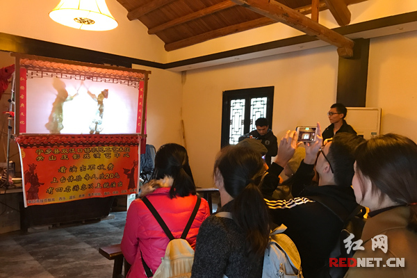 社员们观看传统文化“皮影戏”。
