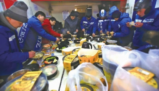 1月29日下午3点,记者于采访途中发现,在饿了么五一复兴二区域外卖站点,十几个送餐员正围在一起热火朝天地吃火锅。该站点负责人刘灵告诉记者,他们已经是今天第二批在此休憩用餐的骑手,而他们的“午餐”是由38火锅免费送上的外卖。