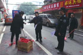2月23日,长沙高桥街道城管办工作人员发传单劝阻商铺燃放鞭炮。组图/记者金林实习生张云峰
