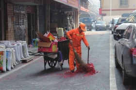2月23日,长沙高桥大市场,保洁人员清扫商户燃放鞭炮后的垃圾。