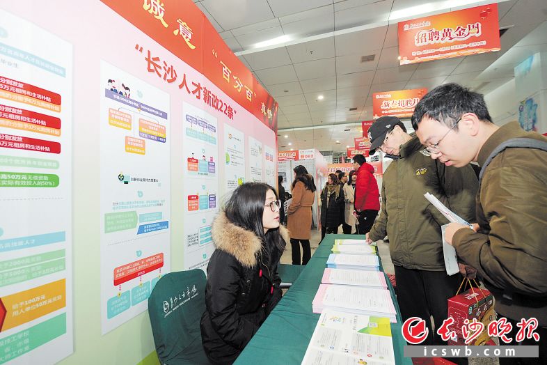 今年初,长沙人才市场主办的春节“招聘黄金周”活动现场,专门设置的长沙人才新政咨询台前排起了长队。 长沙晚报记者 王志伟 摄