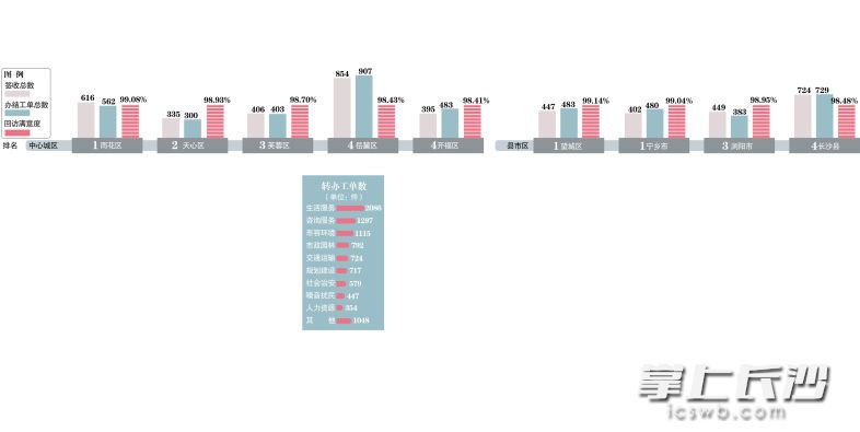 工单办理完之后,热线工作人员会向市民进行回访,询问其是否满意。当月,12345共回访10461件转办工单,涉及76家成员单位,回访满意率达94.8%。12345还会根据各区县(市)办理热线工单的考核指标,进行综合打分。在考核指标综合得分方面,雨花区名列第一,岳麓区及开福区排名靠后。