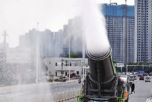 28日,长沙市开福大道,一辆大型抑尘车正在沿路喷雾进行流动除尘作业。近日,两台多功能抑尘车在开福区环卫局正式投入使用。该车车载的“巨炮”启动运行时半小时内可将25吨水化为超微水雾,喷射到120米开外,有效降尘驱霾。记者 田超 通讯员 汤正明 摄