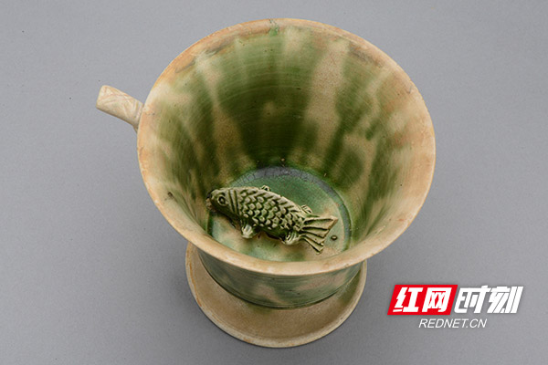 “茶为食物,无异米盐”,唐人爱饮茶。于是,长沙窑中的茶具不胜枚举。用于压碎茶饼的“青瓷茶碾”,用于存放的“青瓷茶盒”,用于烧煮的“绿釉茶铛”,用于取茶的“青釉茶则”,用于盛茶水的“青釉执壶”,用于饮用的“青釉绿彩瓷碗”,用于盛渣的“青瓷渣斗”等,一幅“唐人饮茶图”跃然纸上。