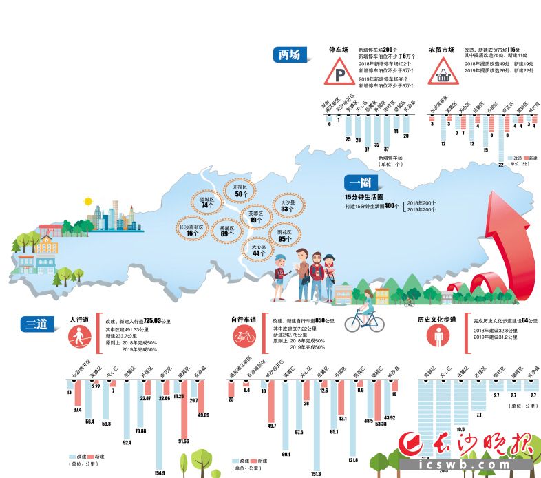 “一圈”是指15分钟生活圈。《计划》明确,2018年至2019年,长沙将重点打造以街道为基础的400个15分钟步行生活圈(大致范围:东至长株高速公路,南至长沙市行政边界,西至绕城高速,北至岳临高速,面积约1300平方公里),完善幼儿园、小学、社区公园、社区公共服务中心、社区文化活动中心、社区多功能运动站场、社区慢行道、社区卫生服务站、居家养老服务站、物业管理用房、公交站点、小型垃圾收集直运站、公共厕所和生活垃圾收集场所等设施配置。