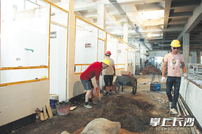 昨日下午2时许,气温持续飙升,在开福区蔡锷北路旁,荷花池生鲜市场提质改造项目正在加紧推进,施工现场随处可见忙碌的工作人员。