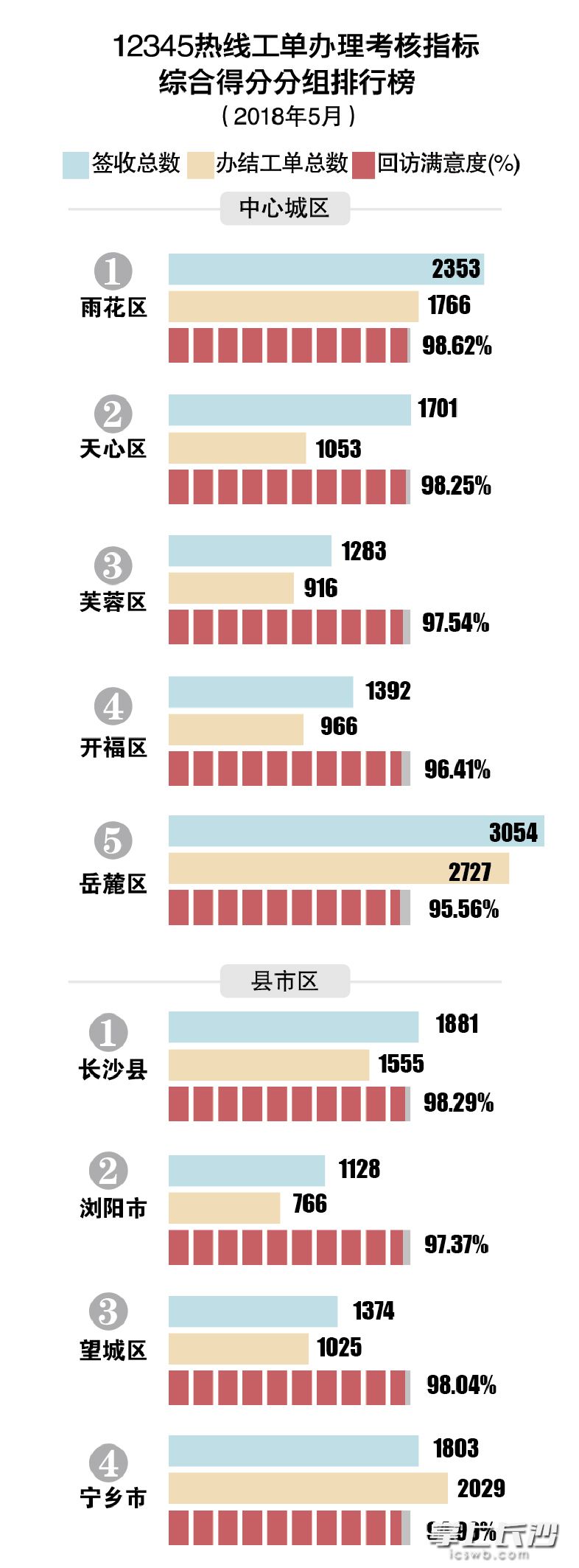 每个月,12345市民服务热线会根据各区县(市)办理热线工单的考核指标,进行综合打分。5月,在考核指标综合得分方面,长沙县名列第一,开福区、岳麓区、宁乡市排名靠后。另外,单从回访满意度这一项指标来看,雨花区名列第一,达98.62%。