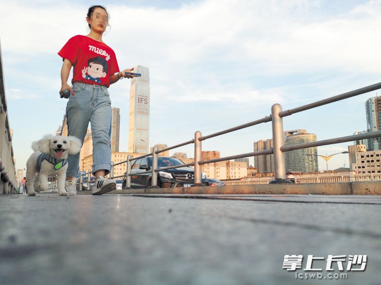 《长沙市养犬管理条例(草案)》提出,在严格管理区内携犬外出时,应在犬只颈部佩戴公安机关发放的智能犬牌,用犬绳牵领犬只。图为昨日下午,一女子牵着一只宠物狗在人行道上行走。长沙晚报记者 黄启晴 摄