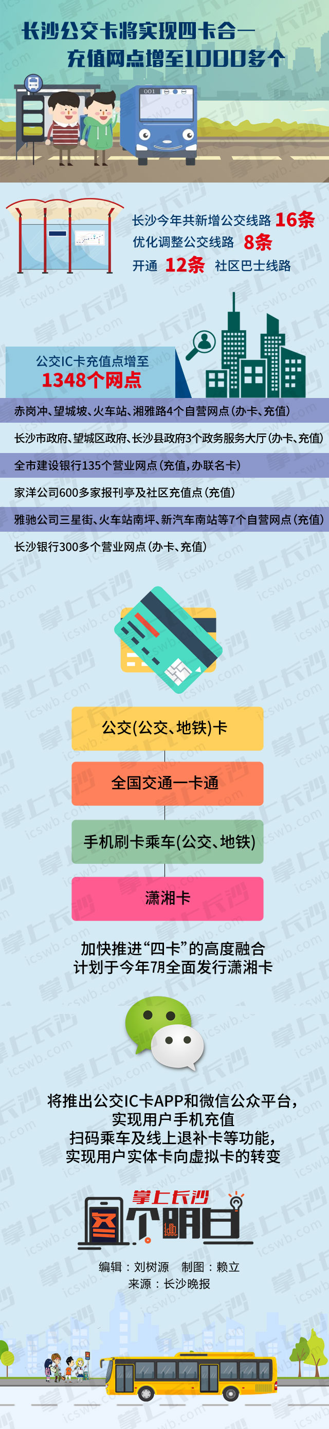 在打造智慧公交中,长沙正加快推进公交(公交、地铁)卡、全国交通一卡通、手机刷卡乘车(公交、地铁)与潇湘卡“四卡”的高度融合,让划于今年7月全面发行潇湘卡。目前,市交通集团IC卡中心通过政府采购正在对内五区及望城区、长沙县9000台公交POS机终端进行更换,以满足“四卡”融合的要求,已有314路、806路、208路等多条公交线路、1000台左右公交车完成了公交P0S机终端更换工作。市交通集团还将推出公交IC卡APP和微信公众平台,实现用户手机充值、扫码乘车及线上退补卡等功能,实现用户实体卡向虚拟卡的转变,乘坐公交车将更方便快捷。