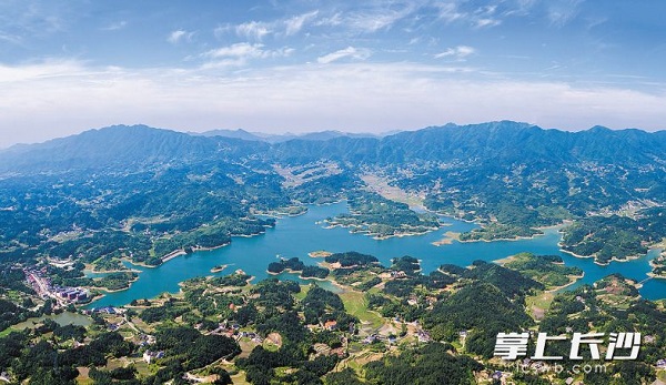 登上海拔860米的芙蓉山顶,远眺群山环绕中的田坪水库,湖面清澈平静,生态保持完好。目前,青山桥镇正以创建国家级3A景区为目标,打造芙蓉山水利风景区。