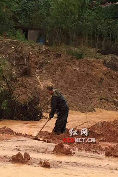 亚洲湖山上组60多岁的党小组长田保长为了不让洪水漫延危害村民,冒着暴雨挖沟防汛。
