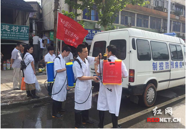7月4日,长沙市、天心区两级救灾防病应急处置机动队准备对湘江中路海信广场段进行消毒。天心区区委书记朱东铁对市疾控中心的大力支援表示感谢,对天心区疾控中心在灾后及时全面的开展防疫工作表示肯定。