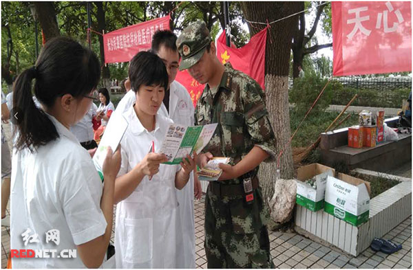 7月4日,长沙市天心区疾病预防控制中心向抗洪武警战士发放防疫防病知识宣传手册。