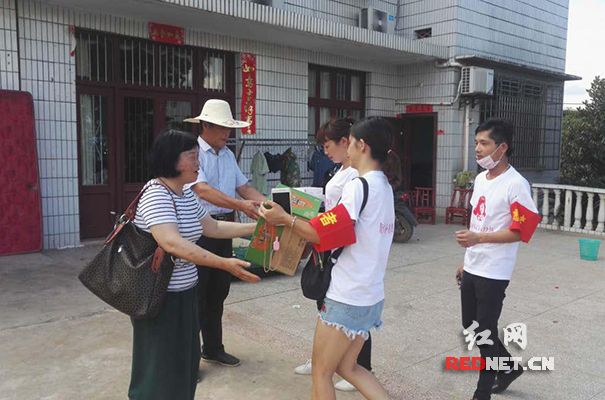 义工队向受灾群众捐赠物资。