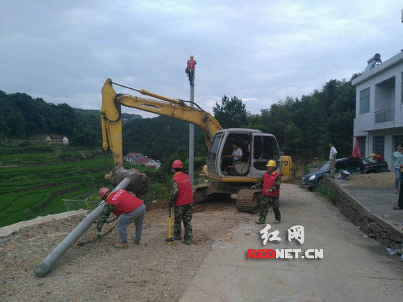 红网长沙7月10日讯(时刻新闻见习记者 雷昕 通讯员 李正苗)洪水滑坡冲刷的深山老林,有他们的身影;悬崖峭壁的大山深处,也是他们在立杆架线,抢修电路,让恢复架设工作有条不紊地进行。