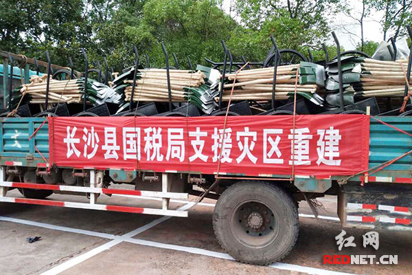 7月9日,为支援宁乡灾区重建工作,长沙县国家税务局组队驱车前往宁乡县巷子口镇运送救灾物资。