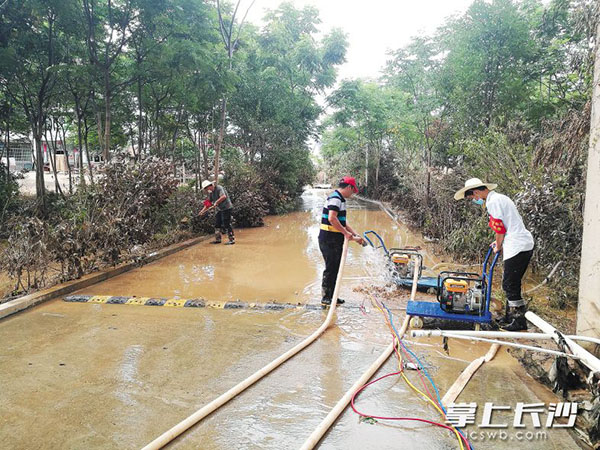 远远望去,岛中低洼处一栋房子的一楼还浸泡在水中,但离洪水留下的水迹最高线低了大一半。岸上,一边是来自长沙电力公司的工人在忙碌着抢修电路,另一边,抽水机轰鸣着,不断从岛中低洼的积水处抽水排放到湘江中。