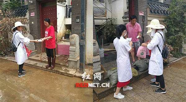 防病救灾队员在汀湘十里小区挨家挨户巡查指导消毒,发放防病宣传资料和防暑降温药物,并进行心理疏导和安抚。