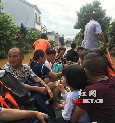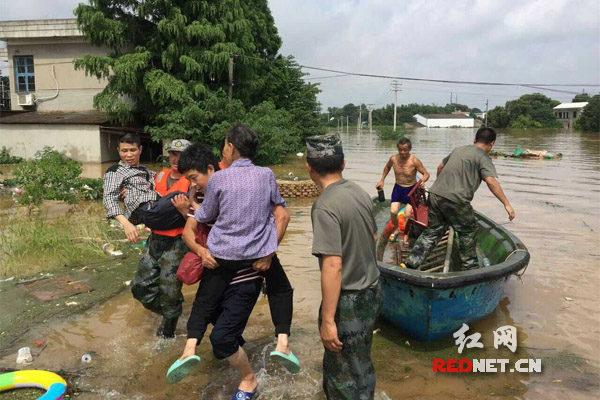 长沙县湘龙街道民兵应急分队队员转移长沙县受灾群众。