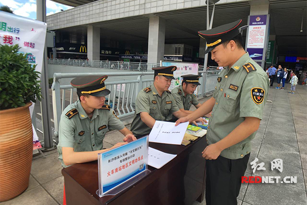 为强化旅客遵规守法、文明出行的意识,火车南站城管中队向广大旅客发放《长沙市市民文明守则》《雨花市民文明手册》《文明手册》《长沙火车南站旅客指引地图》《对路》等宣传资料,利用媒体、网络、微信等平台,引导广大旅客朋友文明出行。同时,加大巡查力度,加强劝导教育,宣传城市管理相关法律法规。