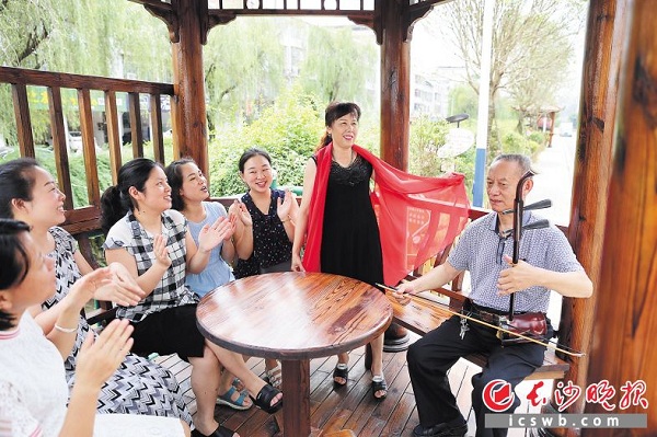 “浏阳河弯过了几道弯,几十里水路到湘江……”浏阳市集里街道淮洲河边的一座凉亭里传来悠扬的二胡声,71岁的赖日升正在演奏自己最爱的《浏阳河》,围观的“粉丝”中有人情不自禁地和着曲子唱起来。