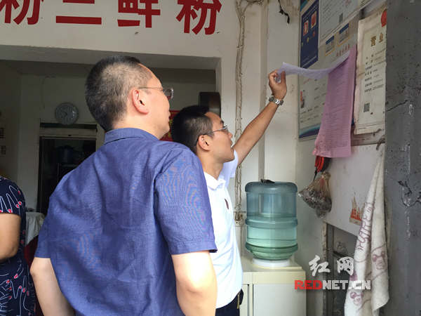 开福区委副书记谢伟峰(右)察看蒋家垅农贸市场内餐饮店老板的健康证明情况。